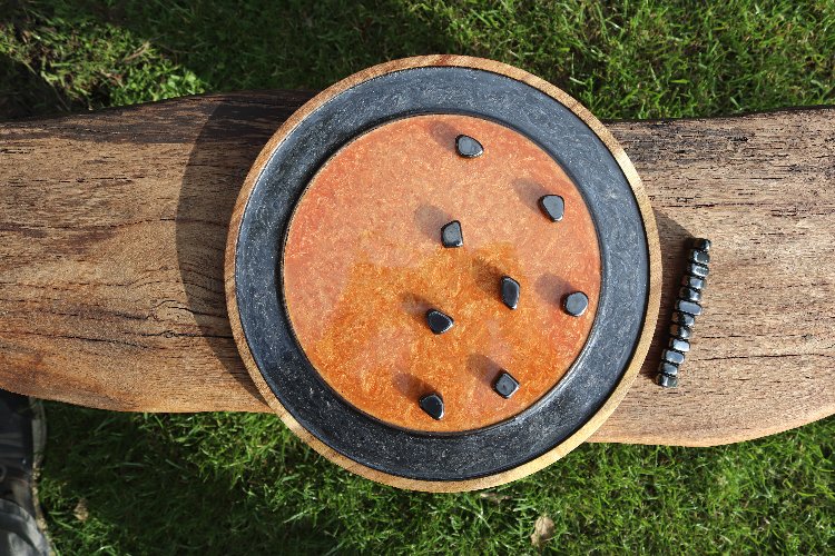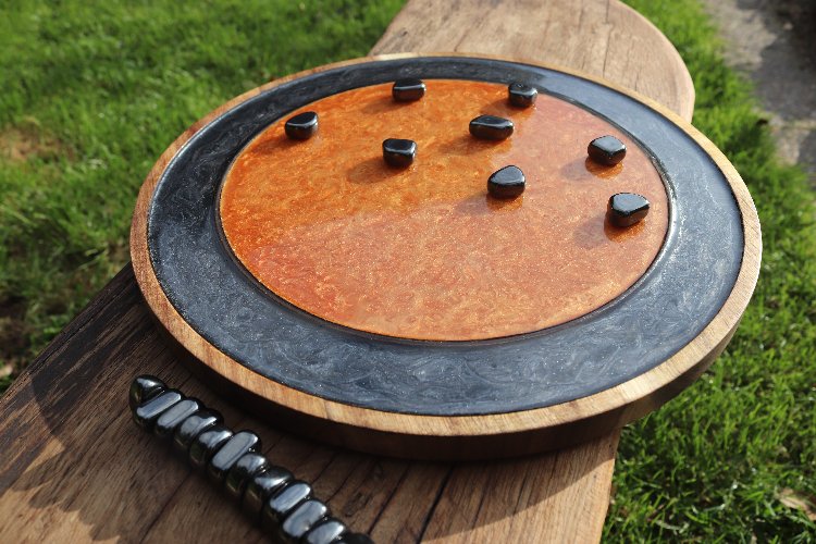Star Fire #3 features the popular orange and black Star Fire theme, though this design is a little more zen than its predecessors, and ideal for those with a calmer, more strategic disposition. Take turns to place the hematite stones inside the ring without any snapping together or take them off the board! First player to place all their stones wins. There is a video in the gallery showing how to play. NB the board in the video is NOT this board. The board in the photos here show the board that's actually for sale here. You can download the rules too from the Rules page.. Thanks!