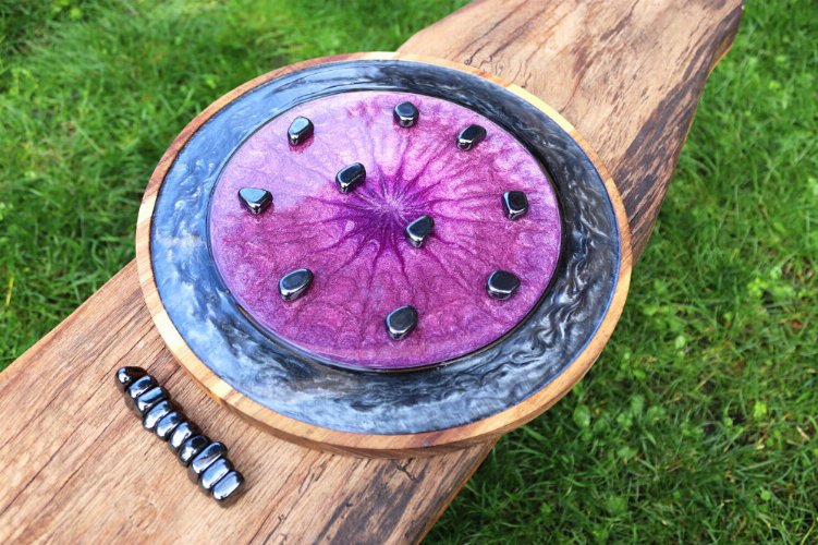 Purple Star #1 is a striking purple star-like design with web-like tendrils reaching toward the silvery cloud swirl of the border. The game includes the board which is approximately 30cm diameter and a set of 20 magnetite stones. Take turns to place the hematite stones inside the ring without any snapping together or take them off the board! First player to place all their stones wins. There is a video in the gallery showing how to play. NB the board in the video is NOT this board. The board in the photos here show the board that's actually for sale here. You can download the rules too from the Rules page.. Thanks!
